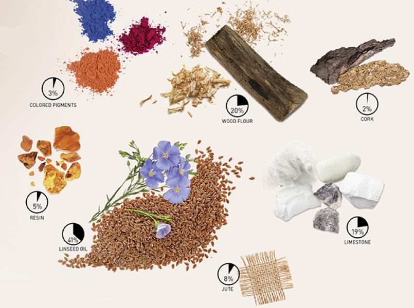 Compuesto en un 98% por materiales naturales, de origen biológico o mineral, el linóleo es nuestro suelo más ecológico. Al incorporar también materiales reciclados y/o 100% reciclables, se inscribe plenamente en un enfoque de economía circular.